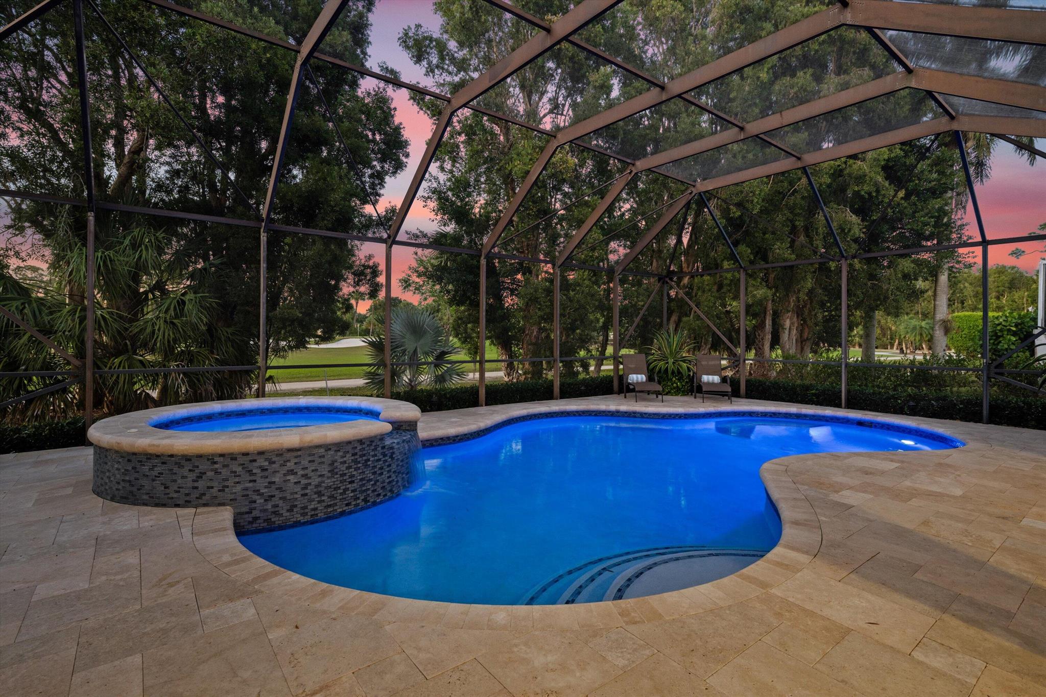Beautiful home in West Palm Beach's Breakers West Country Club on private cul-de-sac street with just 15 homes overlooking 2 fairways of the prestigious Mayacoo Lakes Golf Course. Built in 2005, this spacious 1-story home has almost 2,800 SF living area with 3 spacious Bedrooms, a separate Office, 3 fully renovated Baths and 2-car garage. Great Room has 12 ceilings with crown molding and 8ft sliding doors opening to the pool and patio. Newly renovated pool area as marble stone pavers, new pool surface with new waterline tile as well as a salt chlorination system and pool heater (conveniently controlled by an app). All 3 baths were gut renovated with a high-end finishes from the unique tile, custom built cabinetry, the quartzite countertops, plumbing fixtures, and frameless shower doors. The Primary Bedroom has custom designed California Closet installed in April 2025--a brand new closet for one lucky buyer! Mechanical updates: AC installed 2021; water heater installed 2021; pool remodel done w/new marble pavers, pool surface and waterline tiles-2023; salt chlorination system and pool heater in 2022; new dishwasher 2022. Polaris pool vacuum excluded.